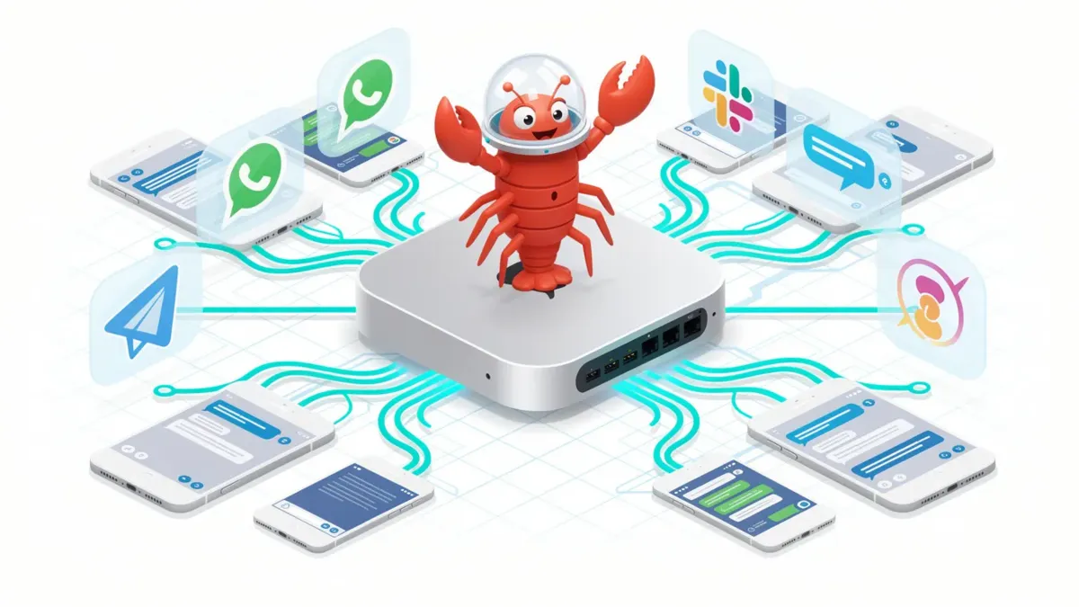 MoltBot Weltraum-Hummer auf Mac Mini mit WhatsApp, Telegram und Slack Chat-Icons