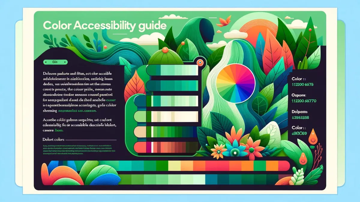 Das Bild präsentiert eine Farbpalette, die von subtilen, wenig gesättigten Farben zu leuchtenden, stark gesättigten Farben übergeht, und symbolisiert die Bedeutung zugänglicher Farbschemata im Design. Farbfelder und ein Farbrad sind integriert, um das Thema hervorzuheben. „Color Accessibility Guide“ steht in fetter, weißer Schrift in der oberen linken Ecke.