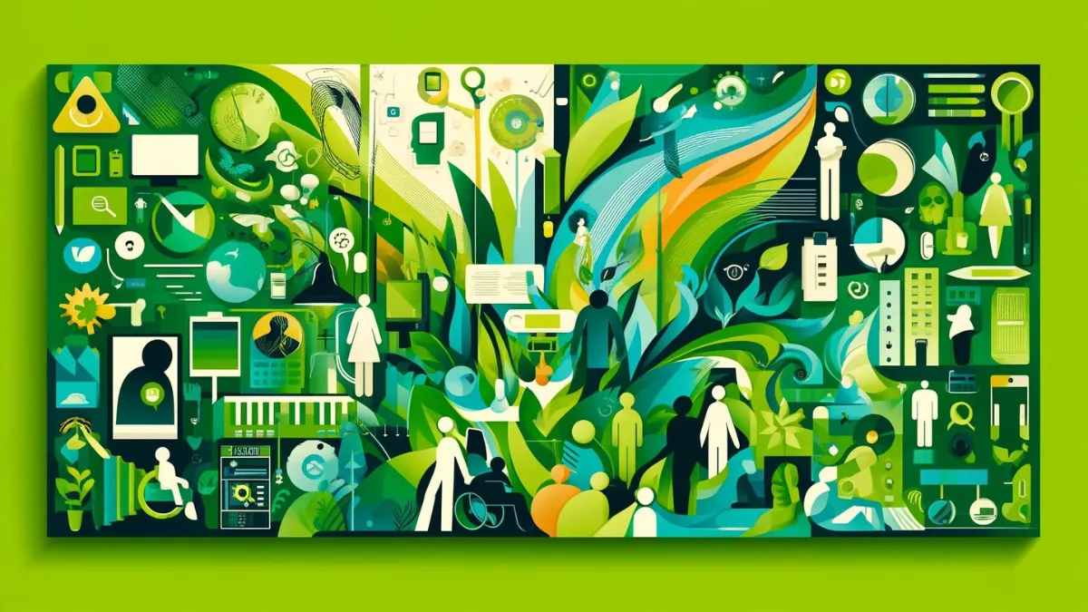 Das Bild zeigt eine harmonische Mischung aus diversen Elementen, die die Zugänglichkeit und Inklusivität im Design symbolisieren, mit menschlichen Silhouetten, verschiedenen Geräten und barrierefreien architektonischen Merkmalen.