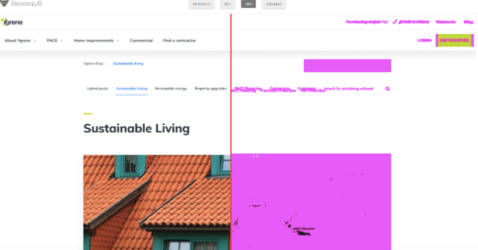 Ein Testbericht von BackstopJS, der die Preisübersichtsseite vergleicht. Links die Referenz, in der Mitte das getestete Bild, und rechts die Unterschiede, markiert in pink. Ein roter Rahmen zeigt einen fehlerhaften Test.