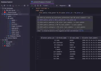 Eine detaillierte Ansicht der Query-Konsole in DataGrip. Die linke Seite zeigt die Datenbankstruktur, während die rechte Seite eine SQL-Abfrage und die zugehörigen Ergebnisse in Tabellenform anzeigt. Autovervollständigungsvorschläge werden hervorgehoben.