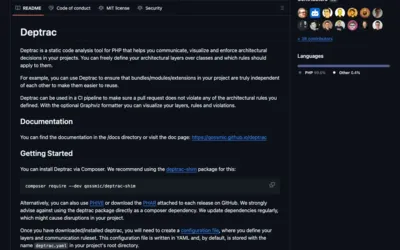 Ein Screenshot der GitHub-Seite des Tools "Deptrac". Es beschreibt die Kernfunktionen von Deptrac als statisches Analysewerkzeug für PHP. Die Informationen umfassen die Installation, Dokumentation und Verwendung zur Visualisierung von Architekturregeln.