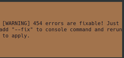 Linux Terminal output: [WARNING] 454 errors are fixable! Just add "--fix" to console command and rerun to apply.