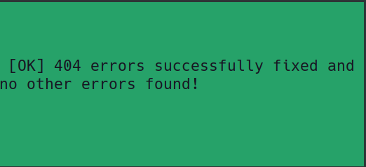 Linux Terminal Output: [OK] 404 errors successfully fixed and no other errors found!
