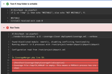 Zwei-teiliger Terminal-Output: Oben ein erfolgreicher Test zur Überprüfung der Schreibrechte im /tmp Ordner mit grünem Häkchen. Darunter ein fehlgeschlagener Test mit roter Fehlermarkierung, der eine ParaTest\Coverage\EmptyCoverageFileException in CoverageMerger.php zeigt.