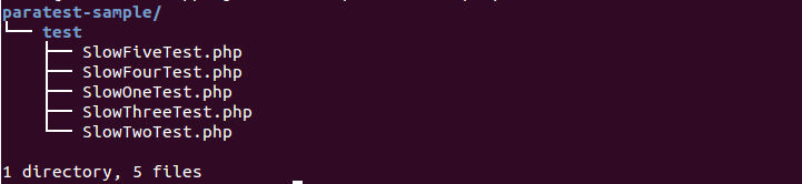 Verzeichnisstruktur eines PHP-Testordners mit fünf Testdateien: SlowFiveTest.php, SlowFourTest.php, SlowOneTest.php, SlowThreeTest.php und SlowTwoTest.php, alle innerhalb des paratest-sample/test Verzeichnisses.
