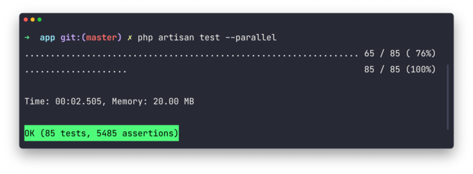 Terminal-Fenster mit Testergebnissen eines Laravel Artisan Befehls. Zeigt einen Fortschrittsbalken mit 85 von 85 Tests (100%), Ausführungszeit von 2,5 Sekunden und Speicherverbrauch von 20 MB. Grüne Erfolgsmeldung bestätigt 85 erfolgreiche Tests mit 5485 Assertions.