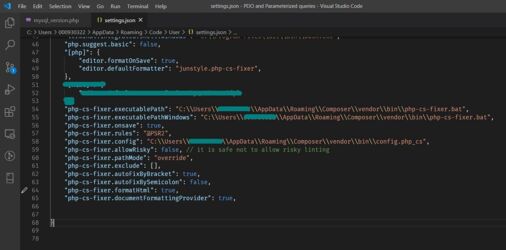 Screenshot einer settings.json-Datei in VS Code mit verschiedenen PHP CS Fixer Konfigurationsoptionen, darunter Regeln, Formatierungseinstellungen und ausführbare Pfade.