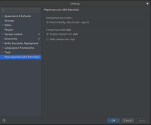 Einstellungsmenü von PHP Inspections (EA Extended) in PhpStorm. Optionen zur Erfassung von Absturzberichten und die Wahl zwischen Regular Comparison Style und Yoda Comparison Style sind sichtbar.
