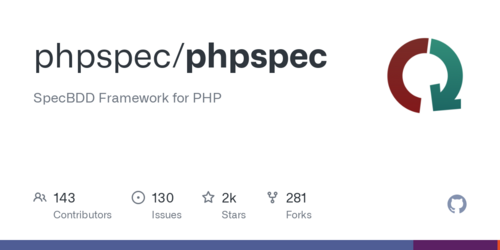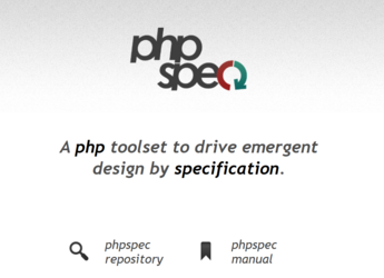 Logo von phpspec mit dem Slogan „A PHP toolset to drive emergent design by specification.“ Darunter Icons für den Zugang zum Repository und zum Handbuch. Die Darstellung vermittelt das Konzept von verhaltensorientierter Softwareentwicklung.
