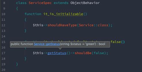 Ausschnitt eines farblich hervorgehobenen Codes mit einer phpspec-Spezifikation für eine Service-Klasse. Methoden wie shouldHaveType und shouldBe(false) zeigen das typische Verhalten von Behavior-Driven Development (BDD) mit phpspec.
