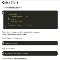 Screenshot aus der Dokumentation von phpspec, der zeigt, wie eine composer.json-Datei mit der Abhängigkeit phpspec/phpspec konfiguriert wird. Weitere Schritte wie composer install und das Erzeugen einer Spezifikationsdatei sind abgebildet.