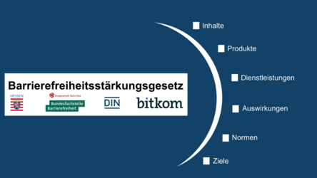 Eine Infografik mit dem Titel "Barrierefreiheitsstärkungsgesetz". Das Bild zeigt die Logos verschiedener Organisationen wie "DIN" und "Bitkom" sowie Stichworte wie "Inhalte", "Produkte", "Dienstleistungen", "Normen" und "Ziele", die den Anwendungsbereich des Gesetzes darstellen.