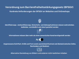 Ein Infografik-Bild mit blauer Hintergrundfarbe, das die Anforderungen des Barrierefreiheitsstärkungsgesetzes (BFSGV) erläutert. Darunter fallen bedienbare Identifizierungs- und Sicherheitsfunktionen, die Bereitstellung von Informationen über mehrere sensorische Kanäle, angemessene Schriftgrößen und Kontraste sowie alternative Darstellungen für visuelle Inhalte.