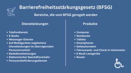 Eine Übersichtsgrafik mit einer Auflistung der Bereiche, die das BFSG regelt. Auf der linken Seite sind Dienstleistungen wie Telefondienste, E-Books und Bankdienstleistungen aufgelistet, auf der rechten Seite Produkte wie Computer, Smartphones und Geldautomaten. Am unteren Rand befindet sich ein Rollstuhl-Symbol.