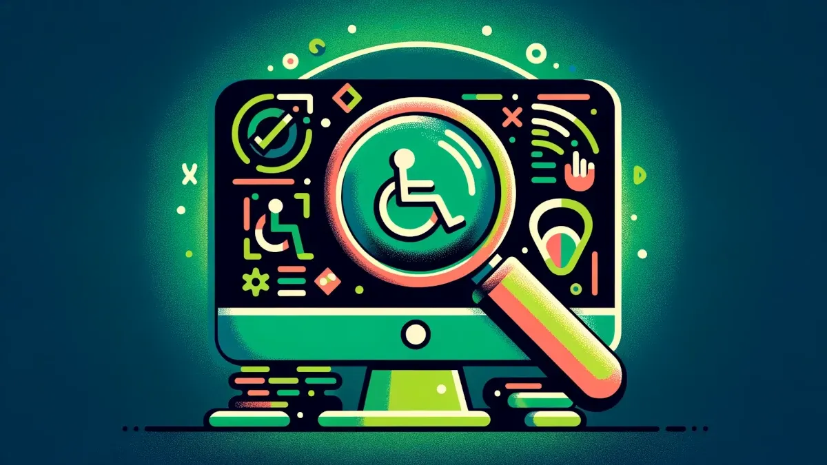 Ein von KI erzeugtes Bild zeigt ein Vergrößerungsglas, das einen Bildschirm mit Symbolen für Webzugänglichkeit in Grün überprüft. Symbolisch und klar!