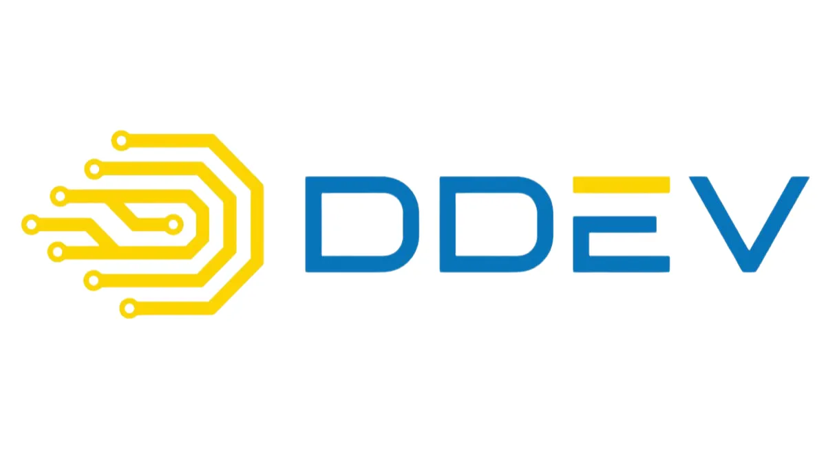 Das Bild zeigt das Logo von DDEV. Es besteht aus einer stilisierten gelben Leiterplatten-Grafik auf der linken Seite, die wie der Buchstabe 'D' geformt ist. Rechts daneben steht der Schriftzug 'DDEV' in einer modernen blauen Schrift, wobei das zweite 'E' durch einen gelben und einen blauen horizontalen Balken dargestellt wird.