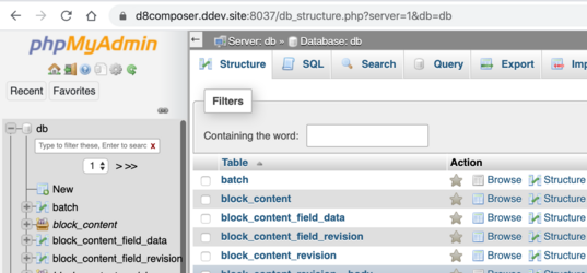 Screenshot von phpMyAdmin mit einer Liste von Datenbanktabellen und Suchoptionen, die zur Verwaltung einer Datenbank angezeigt werden."
