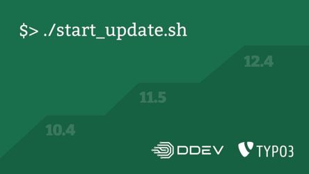 Visualisierung eines Update-Skripts für TYPO3 mit DDEV. Text zeigt verschiedene Versionsnummern und einen Befehl ‘./start_update.sh’ auf grünem Hintergrund.