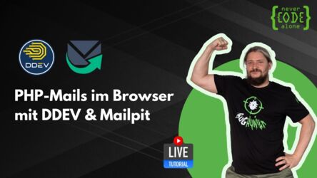 YouTube-Banner mit dem Titel „PHP-Mails im Browser mit DDEV & Mailpit“. Enthält das DDEV-Logo, ein Mail-Logo und eine Live-Tutorial-Kennzeichnung. Rechts posiert eine Person in einem Bug-Hunter-T-Shirt.