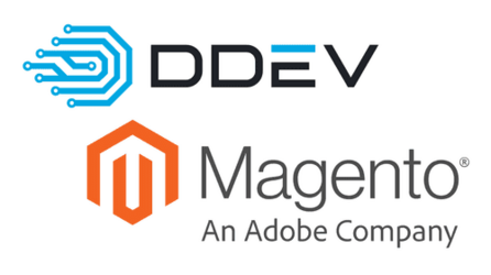 Kombiniertes Logo von DDEV und Magento. Der Text zeigt, dass Magento ein Unternehmen von Adobe ist, unterstützt durch DDEV.