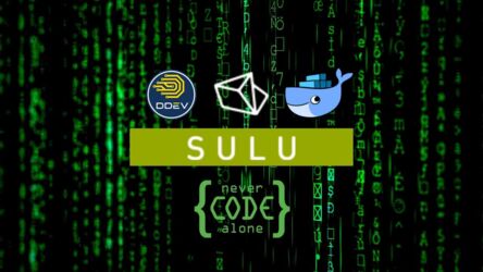YouTube Thumbnail Never Code Alone mit Logos von DDEV, Docker und Sulu vor einem Matrix-inspirierten Hintergrund. Der Text 'Never Code Alone' und 'Sulu' stehen im Vordergrund.