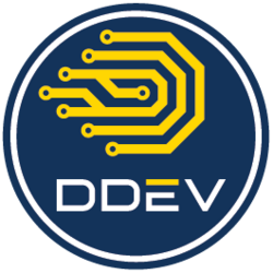 Rundes Logo von DDEV mit einem dunkelblauen Hintergrund, einem stilisierten gelben Schaltkreis-Symbol und dem Schriftzug „DDEV“ in Weiß.