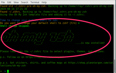 Terminal-Screenshot, der die Installation von Oh My Zsh zeigt, mit einem ASCII-Schriftzug 'Oh My Zsh' und der Aufforderung, die Standard-Shell auf Zsh zu ändern.