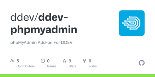 GitHub-Seite für das ddev-phpmyadmin Add-on. Das Logo des Add-ons ist sichtbar, zusammen mit Informationen über Contributors, Issues, Stars und Forks.