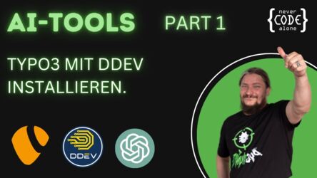 TYPO3 mit DDEV installieren: Banner mit dem Titel „AI-Tools Part 1: TYPO3 mit DDEV installieren“. Logos von TYPO3, DDEV und einer KI (OpenAI) sind sichtbar. Rechts ist eine Person mit einem Daumen-hoch-Pose zu sehen.
