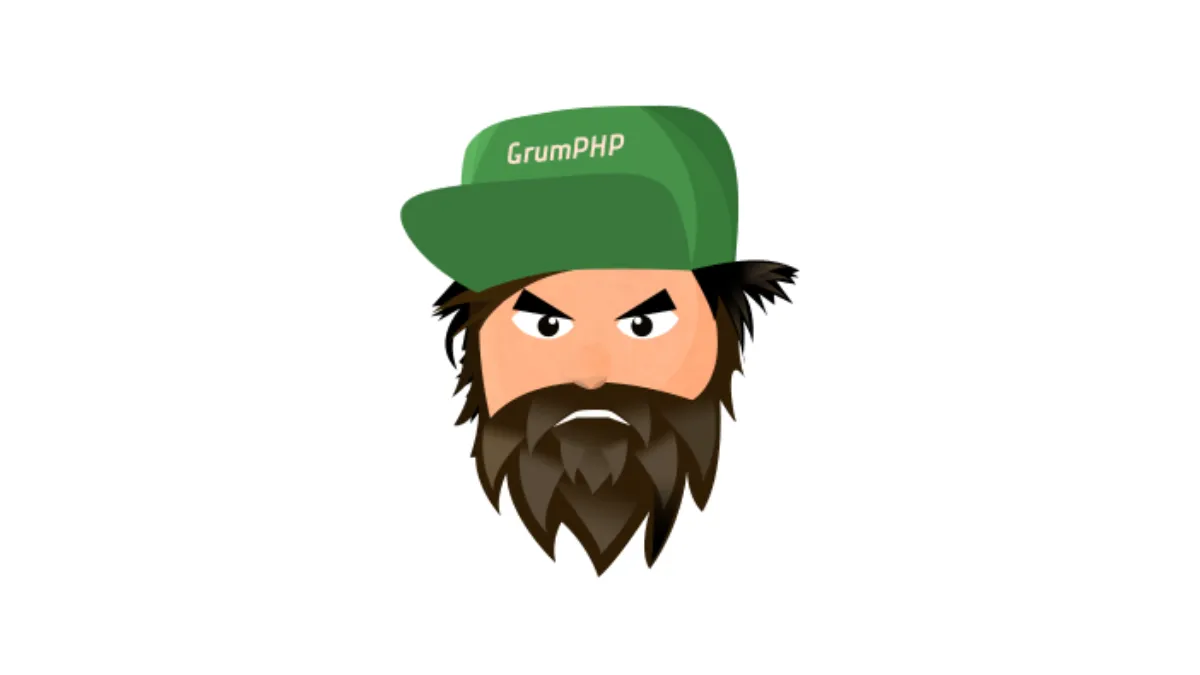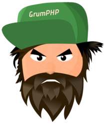 Eine Cartoon-Grafik des GrumPHP-Maskottchens: Ein grimmig dreinblickendes Gesicht mit dunklem Bart und Haaren, das eine grüne Mütze mit der Aufschrift 'GrumPHP' trägt.