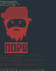 Terminalausgabe von GrumPHP mit einer Fehlermeldung. Der Fehler tritt bei der Codeprüfung mit phpcs auf. Es wird angegeben, dass die öffnende geschweifte Klammer einer Klasse in Zeile 7 nicht korrekt positioniert ist. Die Ausgabe zeigt eine rote ASCII-Grafik eines grimmigen Gesichts mit Bart und Hut sowie das Wort 'NOPE' in großen Buchstaben darunter, was signalisiert, dass die Prüfung nicht bestanden wurde.
