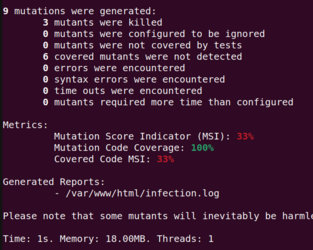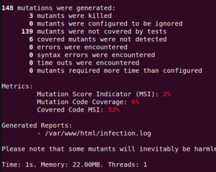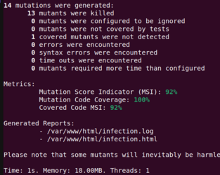 Infection generates a report with the Mutation Score Indicator (MSI), which indicates how well your tests recognise mutations. A higher MSI means better test quality. The results also show you which mutations have survived and where exactly you should improve your tests.