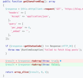 PHP Code-Snippet einer getItemsFromBlog Funktion mit Mutation Testing Markup, das zwei Varianten der toArray() Methode zeigt - eine mit throw:true (rot markiert) und eine mit throw:false (grün markiert).