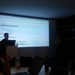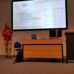 Mann mit langen Haaren hält einen Vortrag auf einer Usergroup vor einem großen Monitor